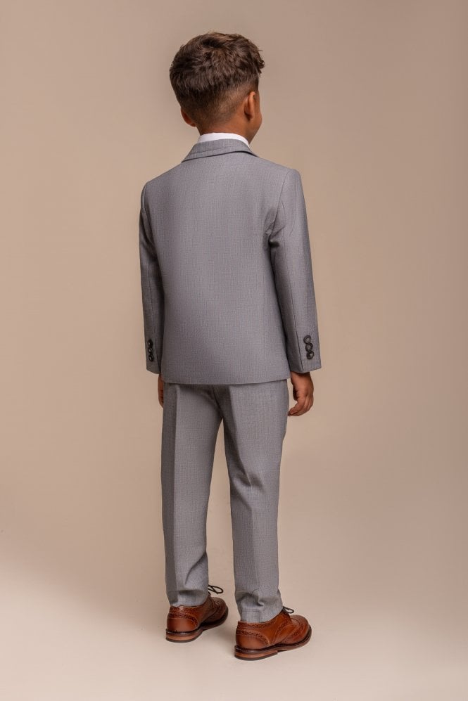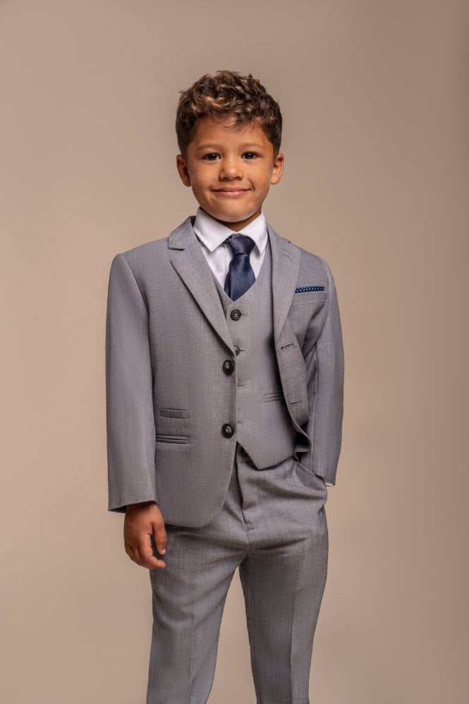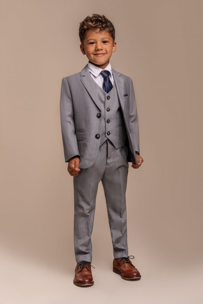 A plain grey 3-pc boys suit. The jacket is accompanied by a matching waistcoat & trousers with an elastic waistband.
